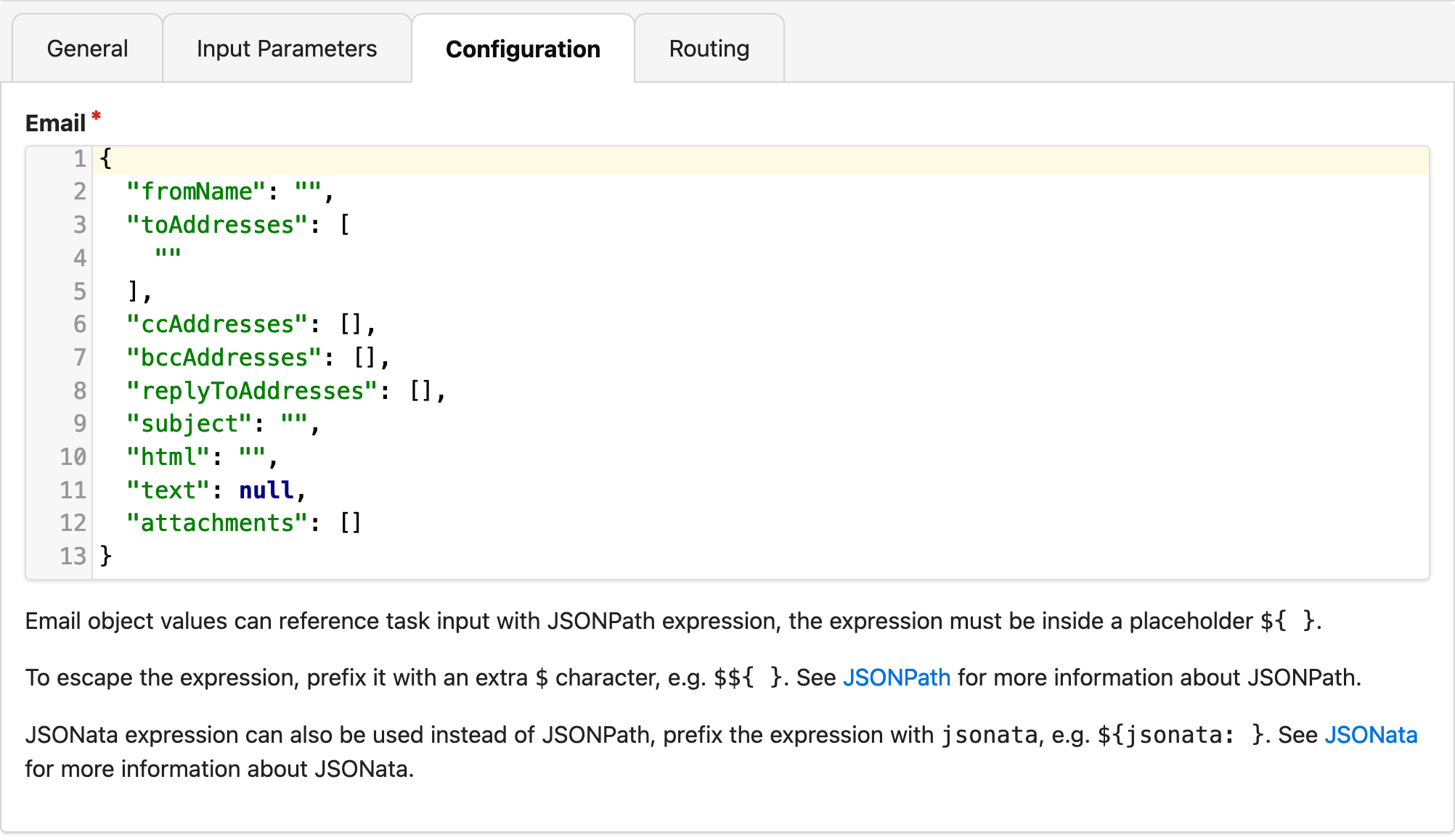 The configuration of the General, Input Parameters, and Routing tabs is similar to that of a user task. We discuss only the Configuration tab here.